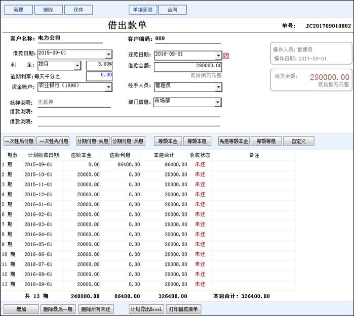 软件可以按年利率、月利率、日利率以及期利率来计算金额和日期,收款方式有以下几种【一次性后付息】、【一次性先付息】、【分期付息-先息】、【分期付息-后息】、【等额本金】、【等额本息】、【先息等额本金】、【等额等息】、【自定义】。还可以设定逾期利率,当还款超期时,按逾期利息收取一定的费用。