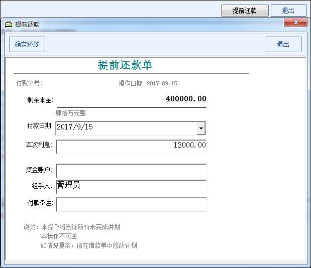 客户提前还清所有本金。若产生利息,软件自动计算,也可自行更改利息金额。本金金额不可更改。