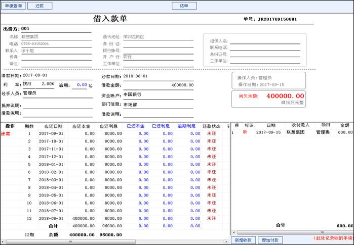 【增加收款】输入跟借入款有关的收款,如 管理费等。